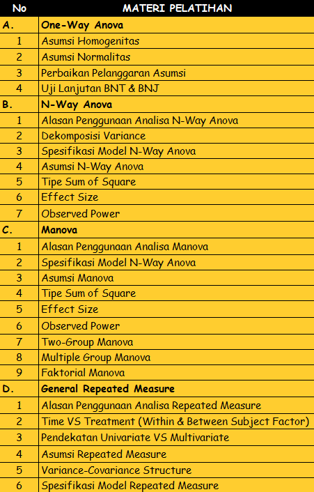 Pelatihan ini disusun dengan pendekatan bertingkat (step-by-step), dimulai dari model sederhana hingga kompleks. Peserta akan dipandu mempelajari One-way ANOVA (satu faktor penyebab), N-way ANOVA (multi-faktor), MANOVA (multi-variabel dependen), hingga Repeated Measures (pengukuran berulang/longitudinal). Melalui simulasi kasus menggunakan SPSS, peserta akan memahami cara mengisolasi efek interaksi antar-variabel dan dinamika perubahan waktu secara akurat.