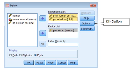 Terlihat nilai signifikan (p-value) 0.677 (lebih besar dari 0.05), yang berarti kita terima Ho (tidak ada perubahan pH sebelum minum dan 15 menit setelah minum.