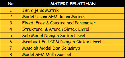 Banyak permasalahan yang dihadapi dalam melakukan analisa SEM, mulai dari data yang kurang memenuhi, dilangarnya asumsi kenoermalan data dan tidak layaknya model yang terbentuk (Model tidak Fit). Permasalahan utama yang sering muncul pada saat melakukan analisa SEM adalah ketidak FIT (Layak) model yang terbentuk sehingga parameter yang dihasilkan masih berbias dan tidak layak untuk dilakukan Interpretasi. Kerumitan model yang dihipotesakan menjadi salah satu faktor penyebab model menjadi sulit untuk dibuat menjadi FIT (Layak). Pelatihan SEM tingkat lanjutan akan mempelajari berbagai teknik dalam usaha untuk membuat model SEM menjadi Fit (layak). Teknik penggunaan sintax Lisrel merupakan metode yang utama yang akan dipelajari pada tahap pelatihan ini.